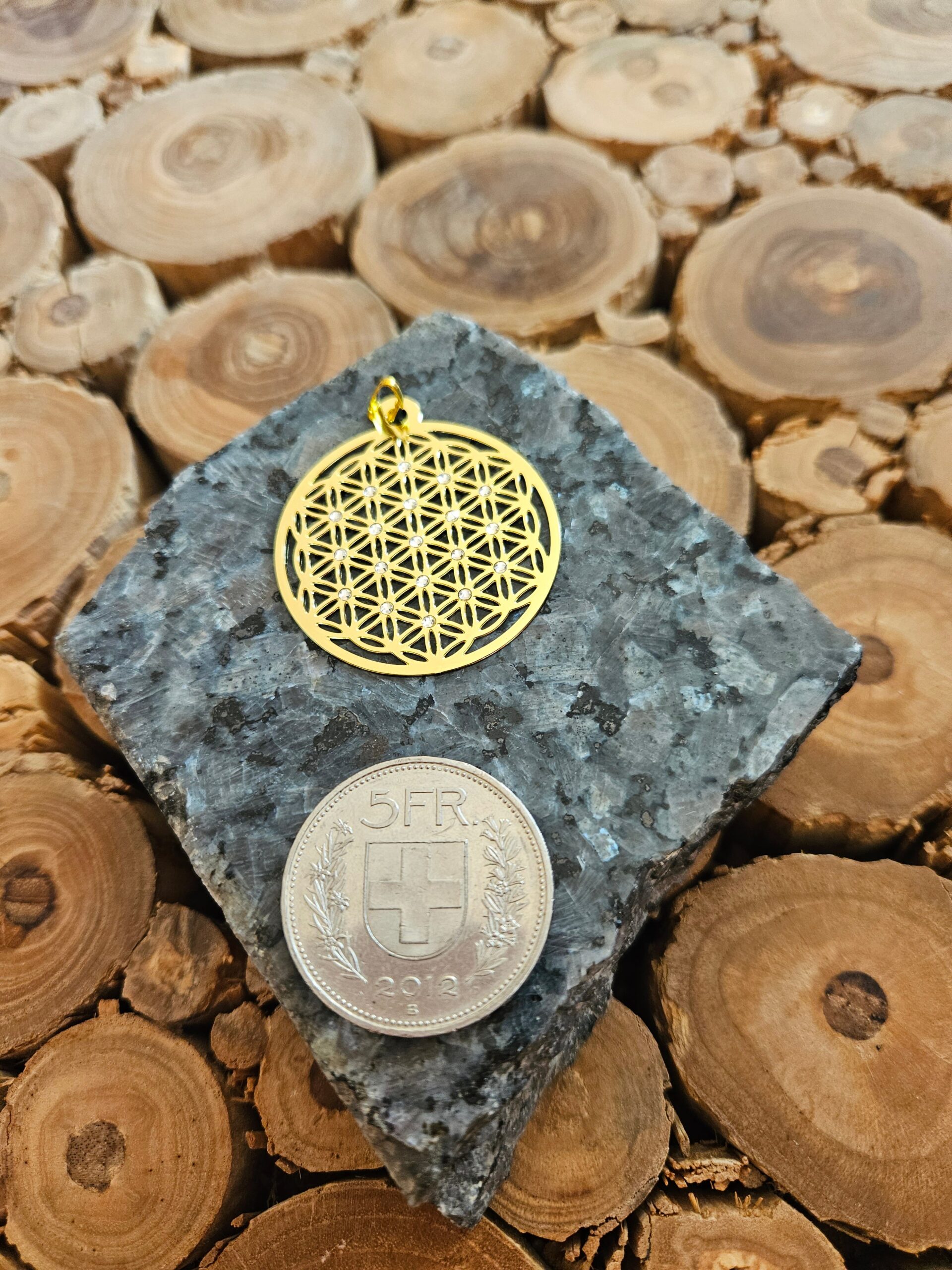 Goldener Edelstahl Lebensblume-Anhänger mit Transparenten Strasssteinen 39mm