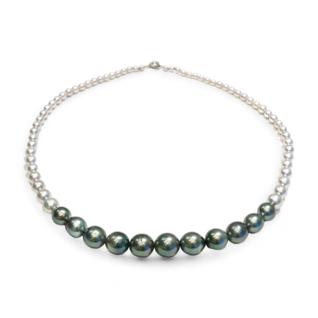 Perlencollier mit 60 weissen Akoya- und 11 dunkelgrünen Tahitiperlen, im Verlauf von 10.5 – 4.5mm, Länge 43cm, mit Druck-Knopf-Verschluss
