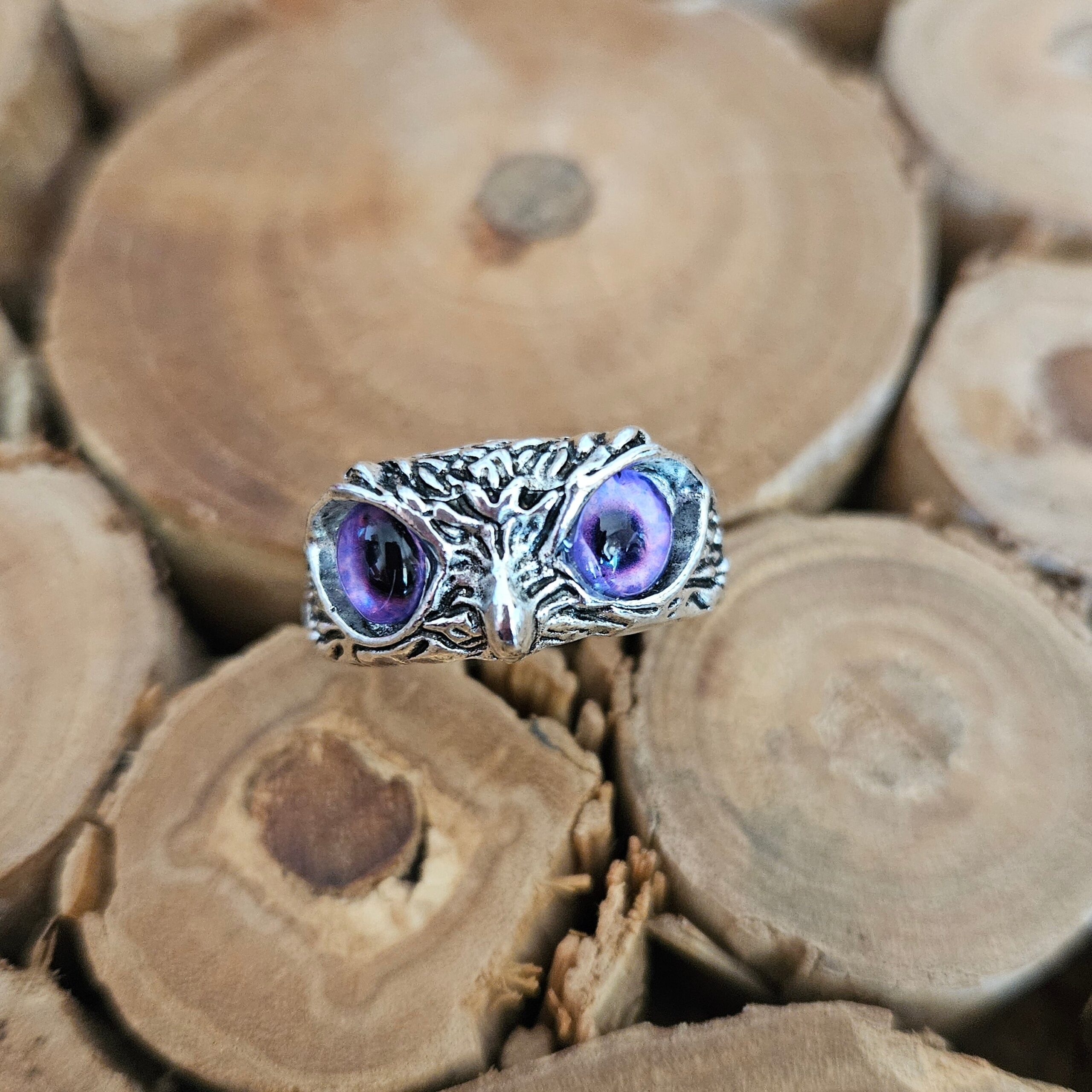 Verstellbarer Eulenring mit violetten Augen