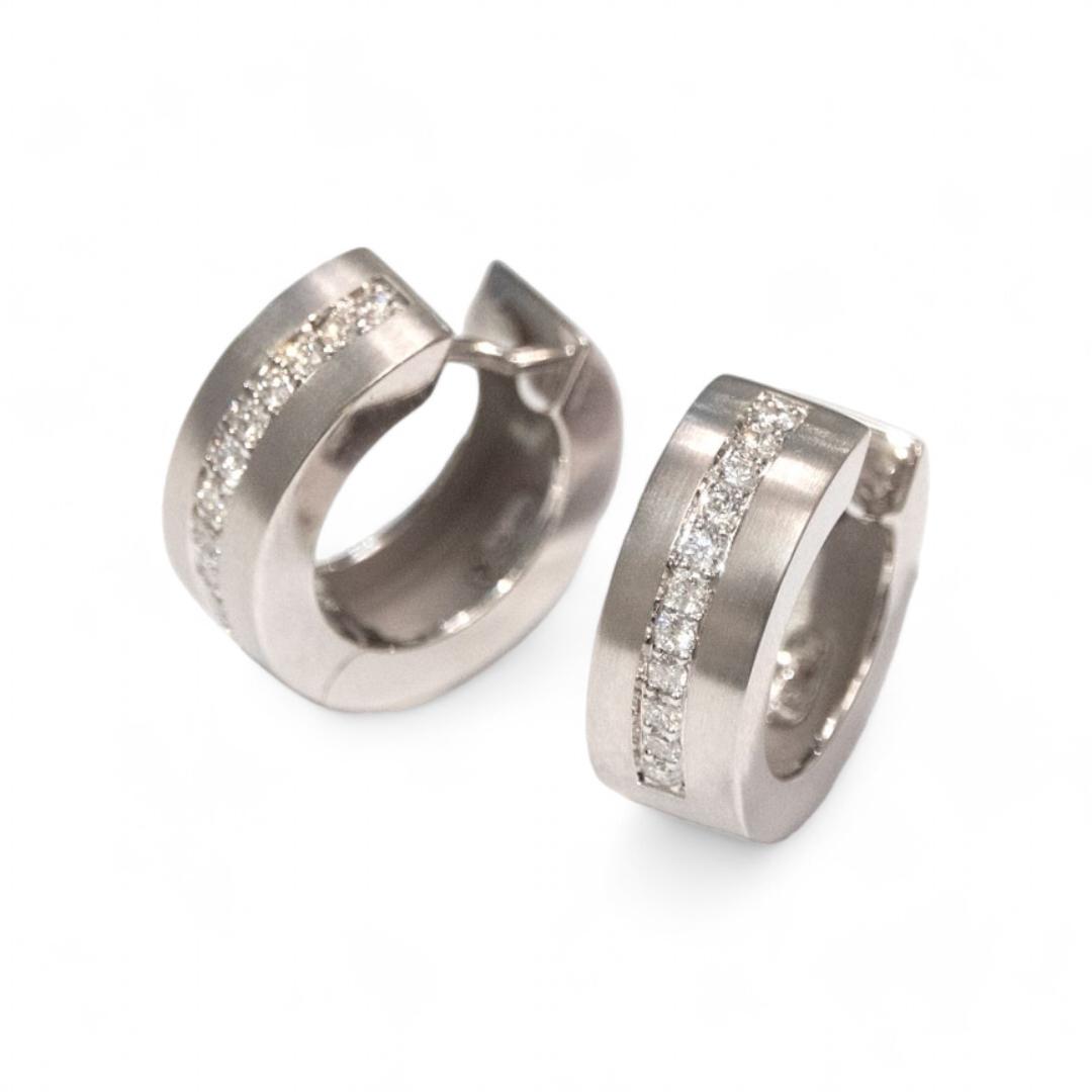 Ein Paar goldene Creolen, Weissgold 750, Oberfläche längsmatt, flach 5 mm breit, ø 13 mm, mit 22 Brillanten H si auf der Vorderseite gefasst